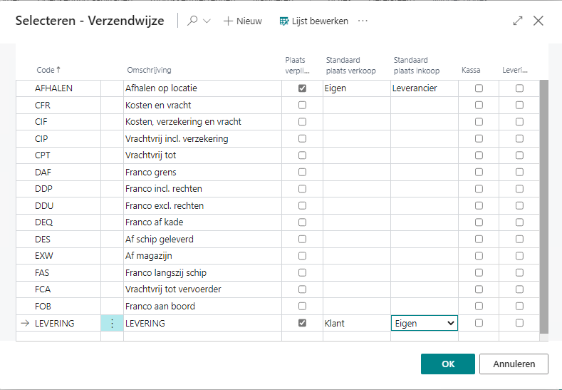 | Standaard plaats verkoop | Geeft aan wat de standaard plaats van de verzendwijze is bij verkoop. De mogelijke opties zijn eigen of klant. |