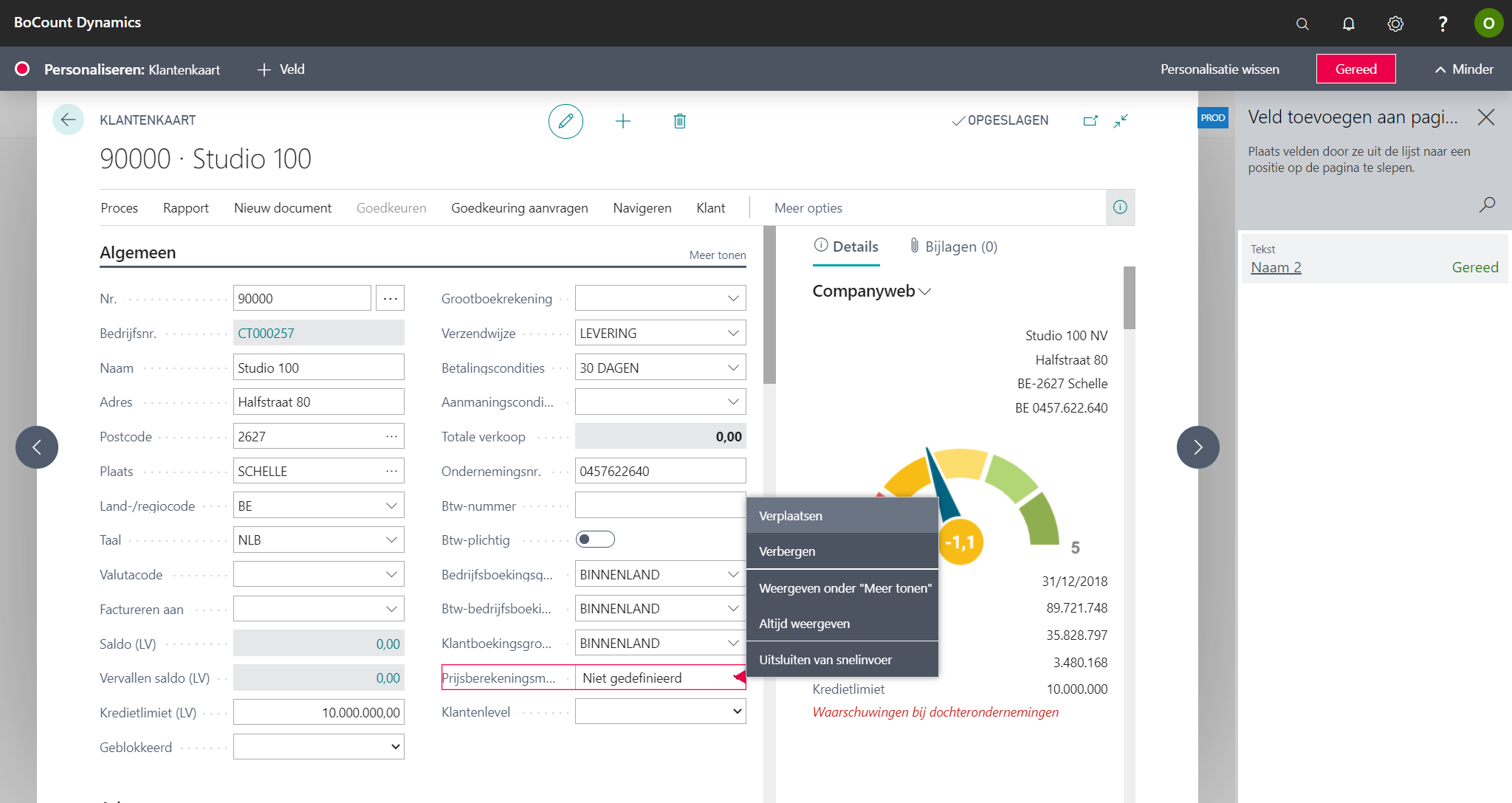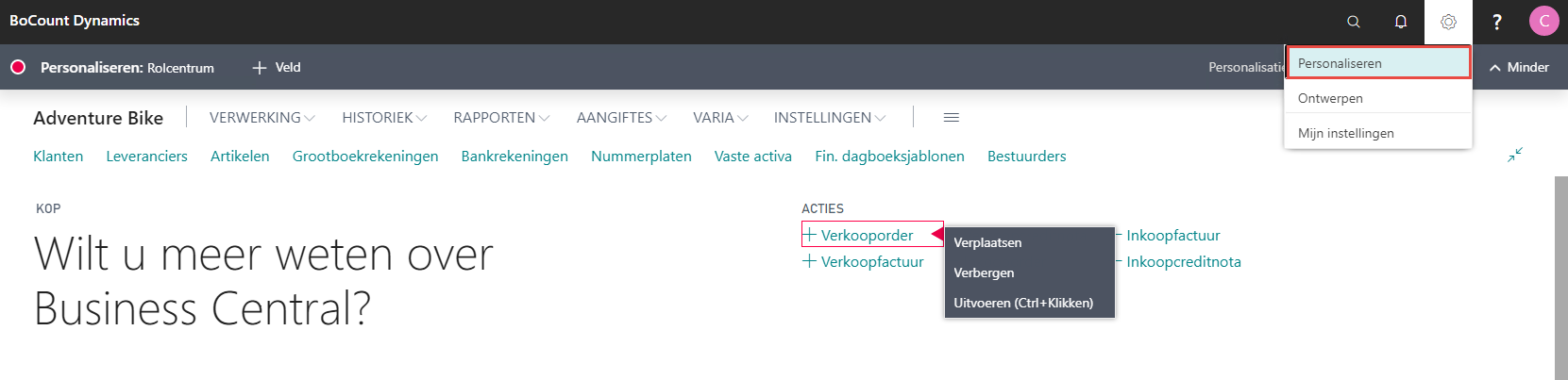 Welke velden, infoblokken en acties worden getoond, kan worden bepaald door te klikken op Instellingen > Personaliseren.