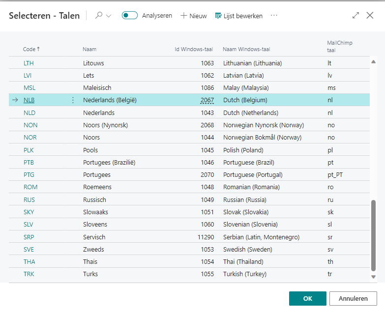 Talen 10/26/2023 2 minutes to read Op de landentabel van Business Central is een veld toegevoegd die de corresponderende taal in MailChimp weergeeft.