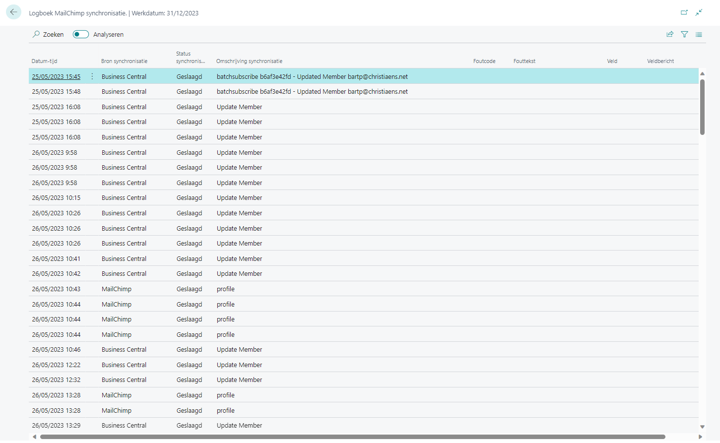 | Bron synchronisatie | Dit is de bron van de synchronisatie. Maw. is de synchronisatie gestart door Business Central of MailChimp. |