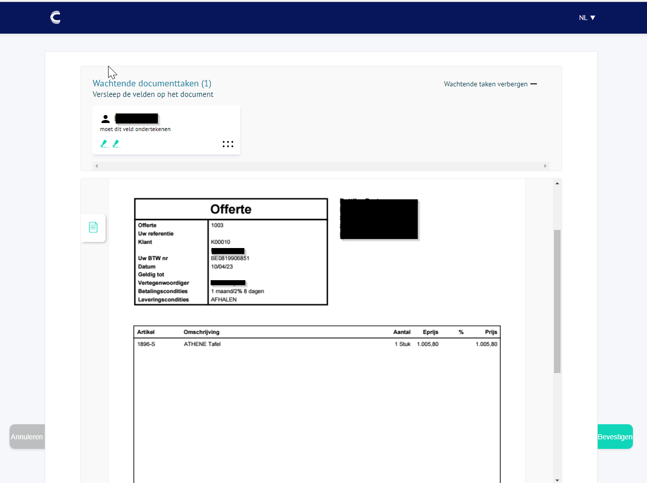 | Bestandsnaam | Selecteer een pdf bestand om op te laden naar Business Central en te laten ondertekenen. |