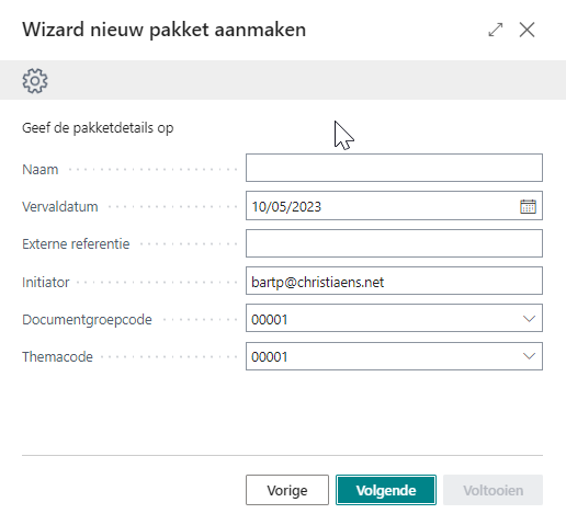 | Initiator | Geef het mailadres van de initatior op. Dit wordt standaard ingevuld met het mailadres van de gebruiker. |