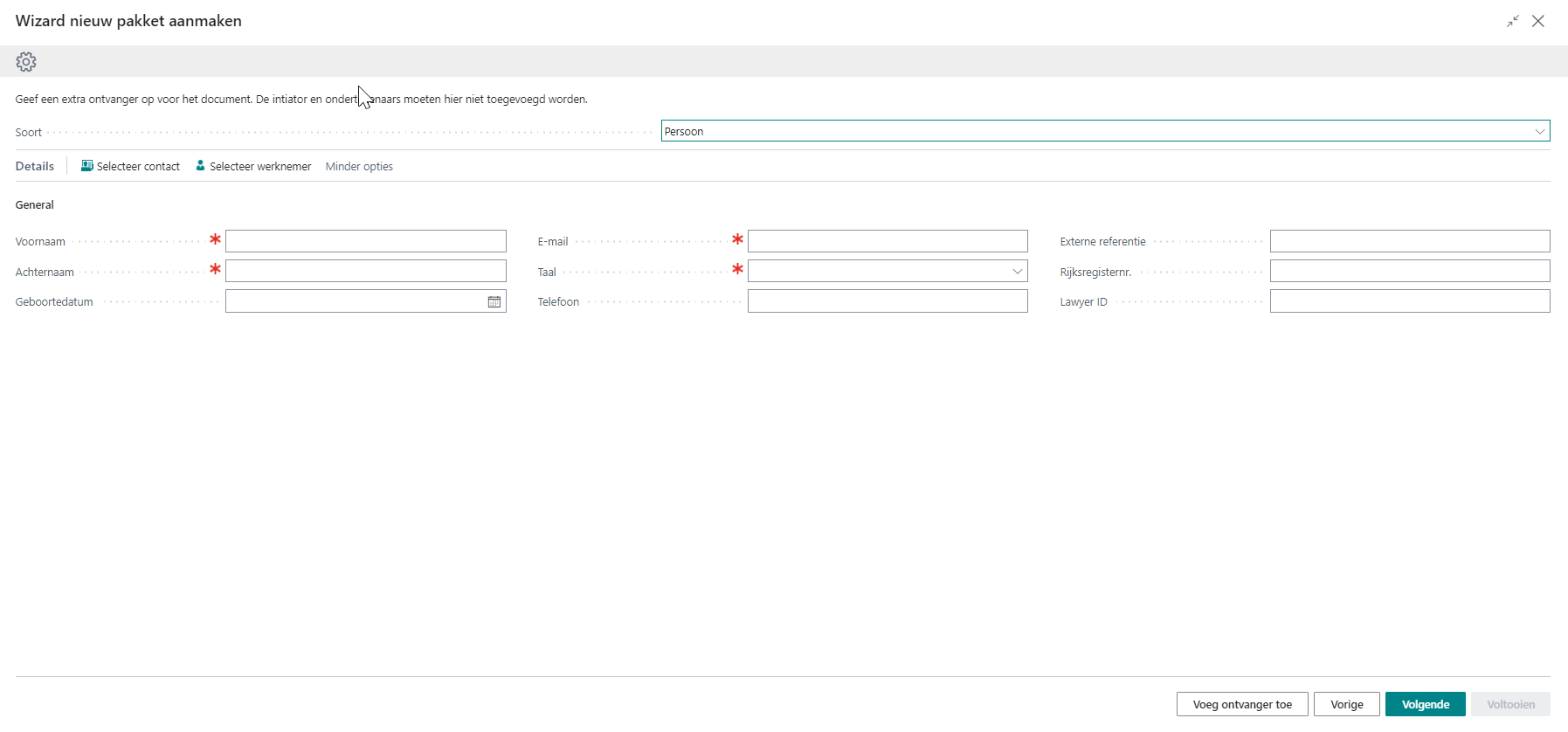 Het is niet nodig om de intiator en ondertekenaars toe te voegen als ontvangers. Initiator en ondertekenaars ontvangen zowieso alle informatie omtrent dit pakket.