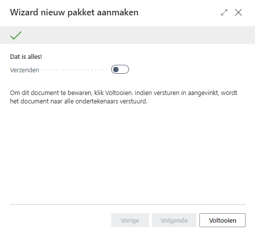 Indien verzenden wordt aangevinkt, dan wordt het pakket naar alle ondertekenaars verstuurd en komt het in status in afwachting.