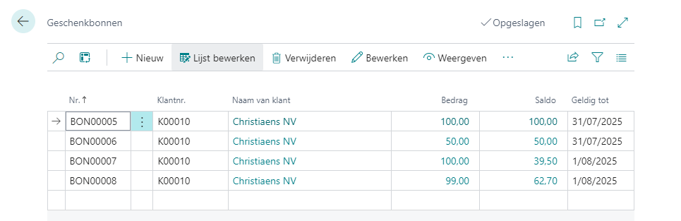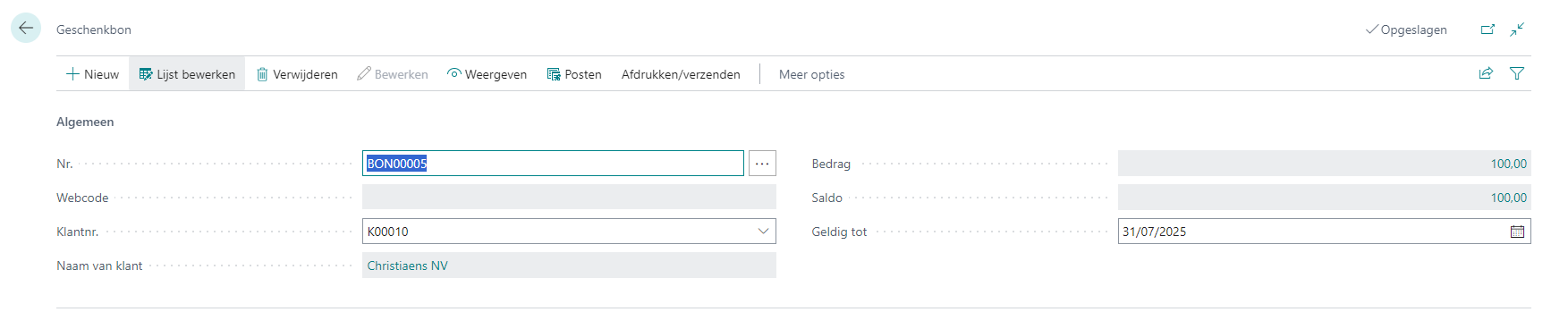 De SPV/MPV-classificatie en btw-context worden technisch bewaard op de historiekposten van de geschenkbon. Raadpleeg posten voor de btw-gerelateerde velden.