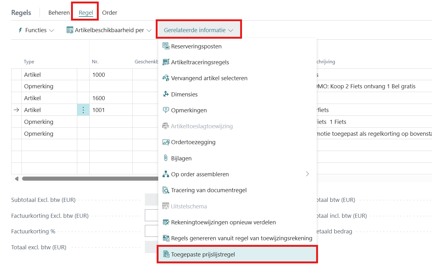 Voor elke documentregel wordt bijgehouden welke prijslijstregels er zijn toegepast. Dit biedt inzicht in hoe het systeem tot een bepaalde prijs en korting is gekomen. U kunt deze informatie gebruiken om te verduidelijken welke prijsafspraken en kortingen op een specifieke orderregel van toepassing zijn geweest.