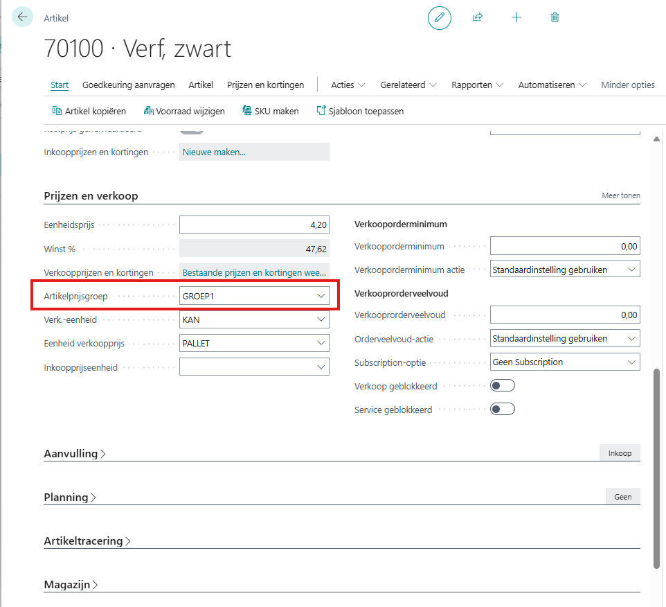 Op een artikelkaart kan ingesteld worden tot welke artikelprijsgroep een artikel behoort: