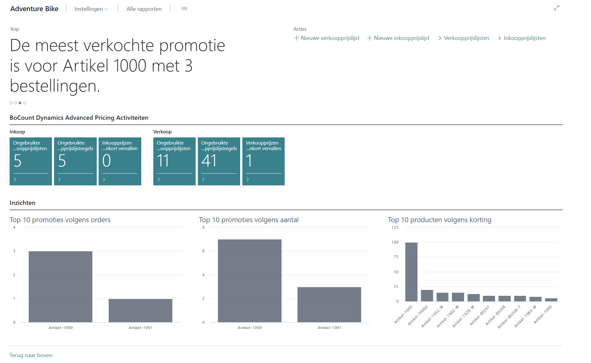 BoCount Advanced Pricing beschikt over een apart profiel en rolcentrum specifiek voor het beheer van prijzen. Vanuit dit rolcentrum kunnen gebruikers eenvoudig nieuwe prijslijsten aanmaken. Daarnaast biedt het rolcentrum een overzicht van recente prijswijzigingen, prijzen die binnenkort vervallen, en informatie over bijvoorbeeld best verkopende promoties. Zo heeft de gebruiker steeds een duidelijk en actueel beeld van het prijsbeheer binnen de organisatie.