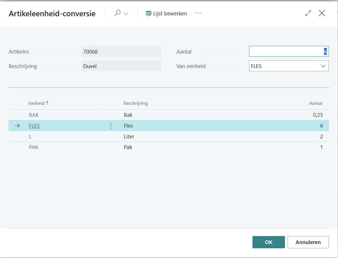 Met BoCount Dynamics Advanced Pricing kunt u eenvoudig het aantal van een orderregel omzetten naar andere eenheden. U kunt doorklikken op het aantal van een orderregel om een scherm te openen waarin alle beschikbare eenheden van het artikel worden weergegeven. In dit scherm ziet u het aantal van de orderregel omgerekend naar elke beschikbare eenheid.