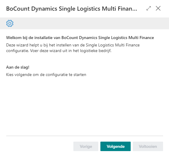 De installatiewizard begeleidt u door het proces van het instellen van BoCount Dynamics Single Logistics Multi Finance. Eens de wizard is doorlopen kunnen instellingen per bedrijf geconsulteerd en nog gewijzigd worden in de BoCount Dynamics Instellingen.