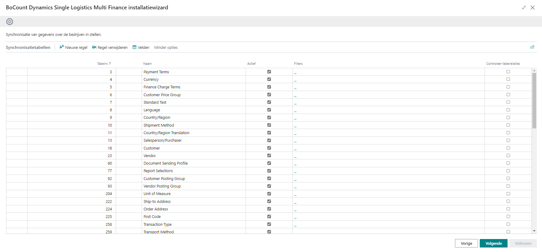 In deze stap wordt de basis-set van synchronisatie-tabellen opgelijst. Deze lijst is een voorstel laar kan aangepast worden indien nodig.
