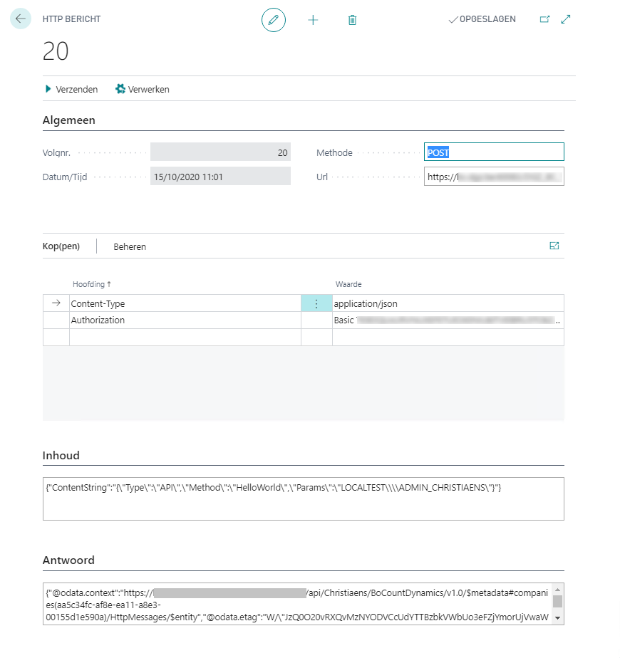 Onder Antwoord wordt het antwoord dat is verkregen van de API call weergegeven.