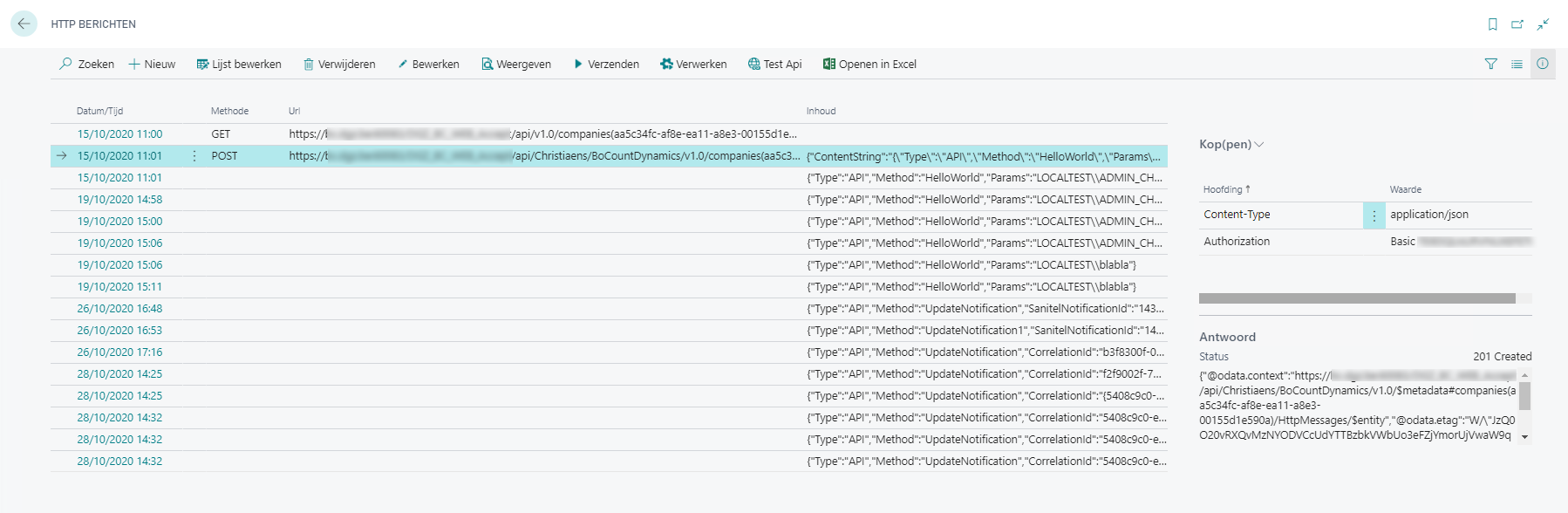 De lijst HTTP berichten toont zowel de uitgaande calls alsook de ontvangen calls.