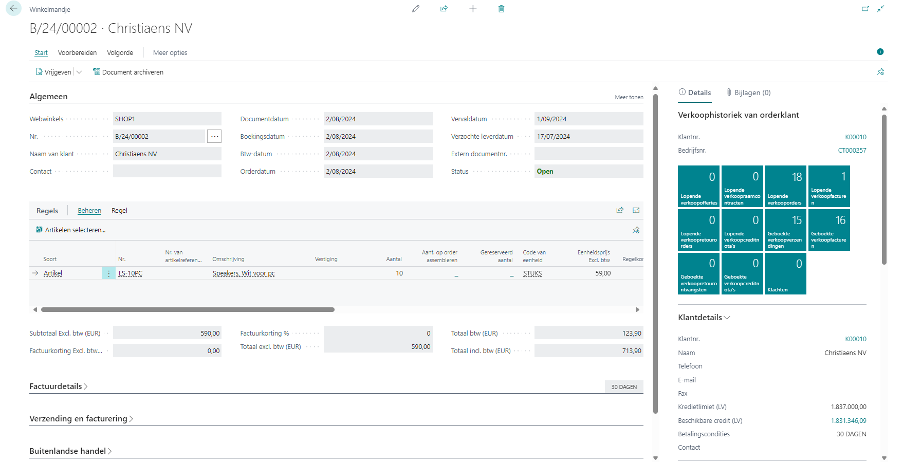Deze is analoog aan een verkooporder in Business Central.