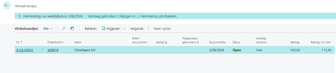 De winkelwagen kan worden geconsulteerd in Business Central.